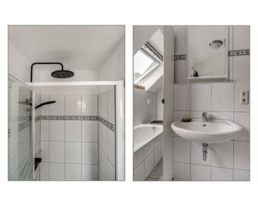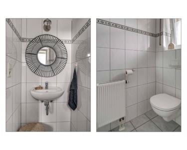 Helles Tageslichtbad mit Badewanne, Dusche, WC und Waschtisch. Zusätzlich ein Gäste-WC im Erdgeschoss mit Fenster.