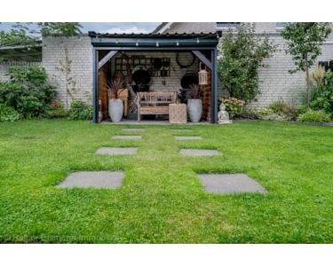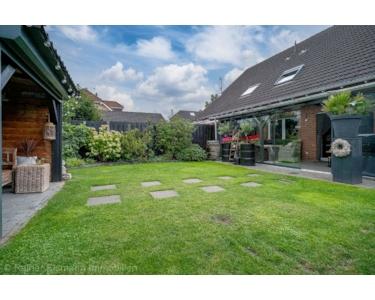 Der liebevoll gestaltete Garten ist pflegeleicht angelegt – mit Rasenfläche, grünen Akzenten und farbenfrohen Blumen. Die überdachte Terrasse lädt zu entspannten Sommerabenden ein. Am Ende des Grundstücks befindet sich ein praktisches Abdach mit elektrischem Rolltor, das sich hervorragend als Grillhütte eignet.