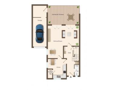 Eingangsbereich mit Gäste-WC und Abstellraum, großzügiger Wohn-/Essbereich, Küche mit Zugang zur überdachten Terrasse