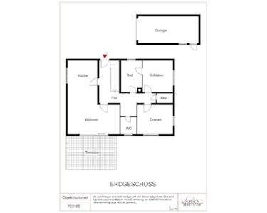 EG: Flur, Wohn-/Esszimmer, Terrasse , Badezimmer, Schlafzimmer, Zimmer, WC, Abstellkammer.