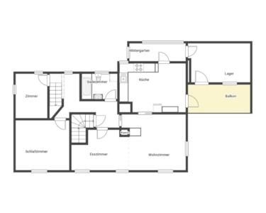* Obergeschoss: offener Wohn-/Essbereich, Küche, Schlafzimmer, Bügelzimmer, Lager, Wintergarten und Balkon