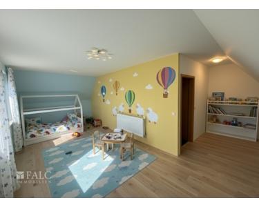Oben bietet das Dachgeschoss viel flexible Fläche: ein großes Kinderzimmer, ein sehr geräumiger Wohn-/Spielbereich (ideal für zwei weitere Kinderzimmer, Homeoffice oder Hobby) sowie ein zusätzliches Bad mit Wellnessdusche. Für noch mehr Platz ist auch der Dachboden ausbaufähig, so dass sich noch zusätzliche Möglichkeiten ergeben. Die Fenster sind dreifach verglast – ruhig, energieeffizient und komfortabel.
