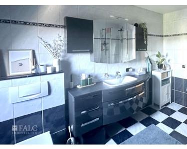 Ein Bad mit Badewanne, Dusche und stilvollen Schränken sowie ein kleines Gäste-Bad mit Waschmaschinen- und Trockneranschluss runden das Angebot im Obergeschoss ab.