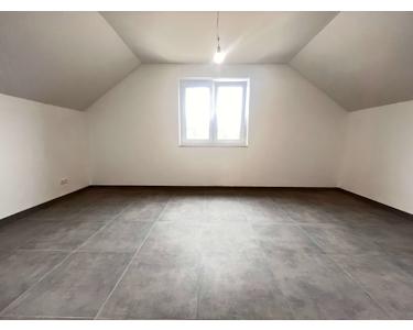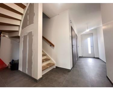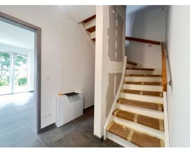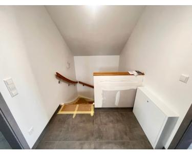 Die Bodenbeläge sind mit einheitlichen, hochwertigen Fliesen ausgestattet, die dem gesamten Wohnbereich eine klare, harmonische Linie verleihen. Besonders ins Auge fällt die geschmackvolle Treppe aus Holz, die als gestalterisches Highlight den Zugang zum Dachgeschoss bildet.