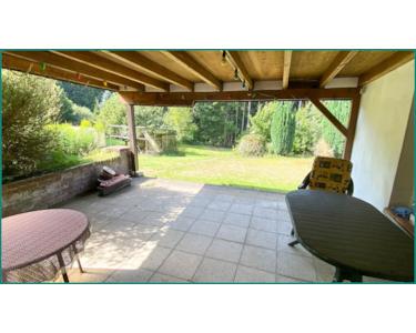 Große überdachte Terrasse mit Panoramablick ins Grüne
