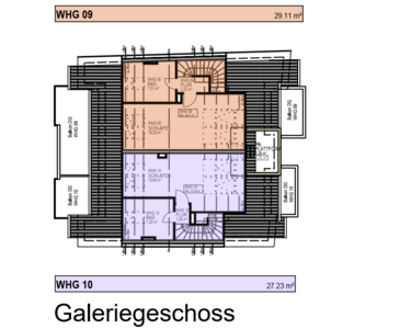 Das Angebot bezieht sich auf die Wohnung 10 im Dachgeschoß = 5.Obergeschoß sowie Galeriegeschoß . Sie gelangen über eine geräumige Diele mit Garderobe in die Wohnung. In der unteren Wohnebene gelangen Sie von der Diele in den hellen Wohn/Eßbereich mit offener Küche von ca. 20 m² mit Ausgang auf Balkon 1 sowie den funktionalen Abstellraum. Von der Diele gelangen Sie ebenfalls in das Duschbad von ca. 5 m² sowie in das schöne Kinderzimmer/Büro von ca. 15 m² mit Ausgang auf den sonnigen Balkon 2. Über eine attraktive Treppe gelangen Sie in das Galeriegeschoß mit dem gut aufgeteilten Schlafzimmer von ca. 19 m² sowie dem Elternbad von ca. 8 m² - ausgestattet mit Wanne und Dusche-. Die Wohnung hat eine Wohnfläche von ca. 83 m². Der Wohnung ist ein Kellerraum zugeordnet.