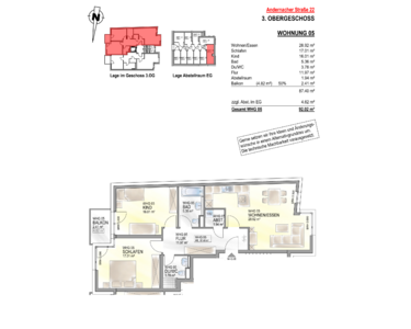 Das Angebot bezieht sich auf die Wohnung 5 im 3. Obergeschoß. Sie gelangen über eine geräumige Diele mit Garderobe in die Wohnung. Von der Diele gelangen Sie in den hellen geräumigen Wohn/Eßbereich mit offener Küche von ca. 29 m² sowie den funktionalen Abstellraum. Von der Diele gelangen Sie ebenfalls in das geräumige Wannenbad von ca. 6 m², das schöne Kinderzimmer/Büro von ca. 16 m² mit Ausgang auf den sonnigen Balkon sowie das gut aufgeteilte Schlafzimmer von ca. 16 m²- ebenfalls mit Ausgang auf den sonnigen Balkon von ca. 5 m². Die Wohnung hat eine Wohnfläche von ca. 88 m². Der Wohnung ist ein Kellerraum zugeordnet.