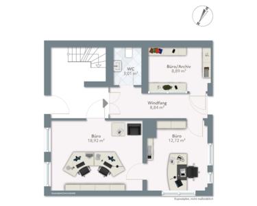 Ein effektiver Grundriss mit 2 homogen geschnittenen Räumen bieten diverse Gestaltungsmöglichkeiten. Der 3. Raum ist gut als Archiv oder Abstellfläche zu nutzen.