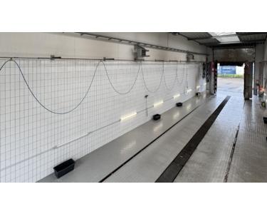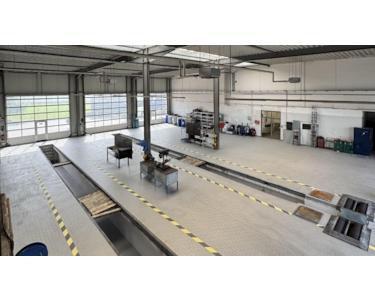 Zentral auf dem Grundstück befindet sich das Herzstück mit der Bürofläche und den Sozialräumen, direkt angrenzend an den Hallenbereich, der sich in Werkstattbereich und Waschstraße aufteilt. Die Werkstatt verfügt über drei Abschnitte, welche jeweils über große Tore be- bzw. auch durchfahrbar sind. Zwei dieser Abschnitte sind mit einer Grube für Reparaturarbeiten ausgestattet. Im letzten Hallenabschnitt ist die halbautomatische Waschanlage untergebracht.