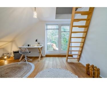 Vom Kinder -/ Arbeitszimmer führt eine Treppe in den ausgebauten Dachgiebel mit einer Schlafmöglichkeit.