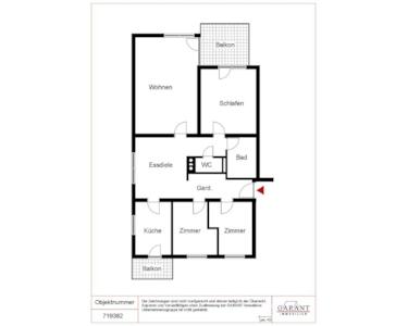 Diele, 2 Kinderzimmer, Essbereich, Küche mit Zugang zum Balkon 1, Wohnzimmer mit Zugang zum Balkon 2, Elternschlafzimmer mit Zugang zum Balkon 2, Badezimmer, Gäste-WC