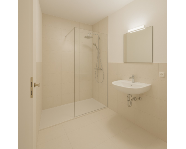 Das Badezimmer wurde frisch saniert und mit edlen Materialien ausgestattet. Hier finden Sie eine großzügige, bodengleiche Dusche mit Echtglasabtrennung, moderne Armaturen und geschmackvoll ausgewählte Fliesen in Naturtönen. Zusätzlich steht Ihnen ein separates Gäste-WC zur Verfügung – ideal, wenn Besuch kommt oder Sie Berufliches und Privates räumlich trennen möchten.