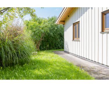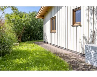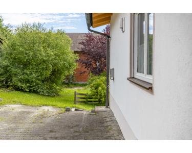 Besonders reizvoll: Der sonnige Südgarten lädt zum Entspannen, Gärtnern oder Spielen ein, während die Zufahrt von Norden angenehm unauffällig und praktisch gestaltet ist. Die leichte Hanglage sorgt für charmante Ausblicke – vor allem aus dem oberen Wohnbereich, wo der Blick bis zu den Hügeln reicht.