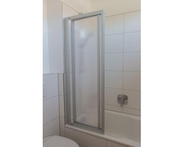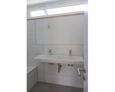 Das Badezimmer im ersten Obergeschoss erhielt im Zuge der Sanierung eine niedrige Badewanne mit Duschtrennwand und Duschbrause, ein Doppelwaschbecken mit zwei Armaturen, eine Toilette und einen Handtuchheizkörper sowie eine elektrische Fußbodenheizung. Die weißen Wandfliesen sind harmonisch auf die grauen Bodenfliesen abgestimmt. Ein Fenster sowie eine Lüftung sind vorhanden.