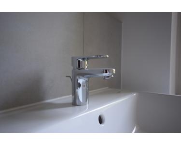 Das geflieste Badezimmer verfügt über moderne Sanitärobjekte sowie eine Dusche.
