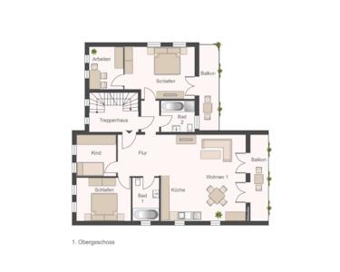 Das Obergeschoss umfasst ca. 119 m² Wohnfläche mit fünf Zimmern, offenem Wohn-/Essbereich und zwei Balkonen.