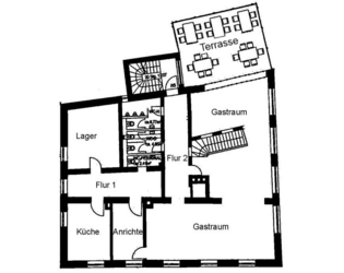 Das Gastroobjekt verfügt über ca. 50 Innensitzplätze und ca. 20 Außensitzplätze. Eine geflieste Treppe führt direkt in den Gastraum. Er ist mit Vinyl ausgelegt und aufgrund der großen Kunststofffenster sehr hell und freundlich. Eine Beleuchtung ist vorhanden. In der gefliesten Küche befindet sich eine neue Edelstahl-Gastroküche mit modernen Geräten. Der Lagerraum mit der Kühlzelle, die Anrichte sowie die Flure sind ebenfalls wie auch die WCs modern gefliest.