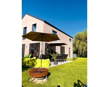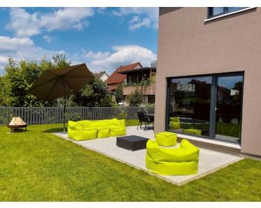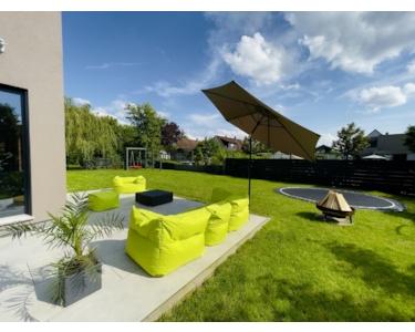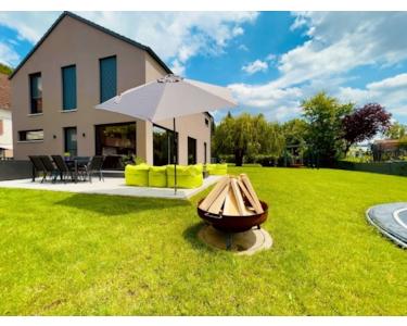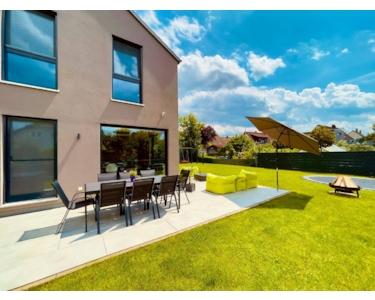 Die großzügige Terrasse lädt zum Verweilen ein und bietet Raum für gesellige Stunden im Freien. Eine Regenwasserzisterne ermöglicht eine nachhaltige Bewässerung des Gartens und spart zudem Niederschlagsteuer.