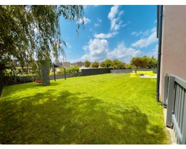 Der Gartenbereich mit einer großen grünen Wiese bietet Platz für individuelle Gestaltungsmöglichkeiten. Ein Gartenhaus mit kleiner Werkstatt ermöglicht kreative Tätigkeiten und die Aufbewahrung von Gartengeräten.