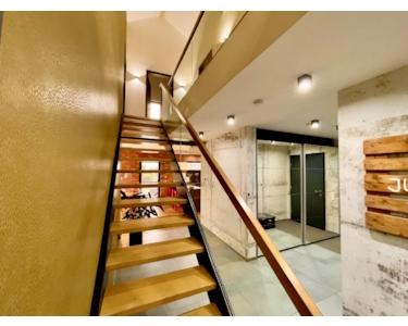 Die Inneneinrichtung besticht durch eine beeindruckende industrielle Ästhetik, geprägt von schwarz lackierten Stahlträgern, Wandverkleidungen mit Ziegelsteinblenden und Betonoptik.