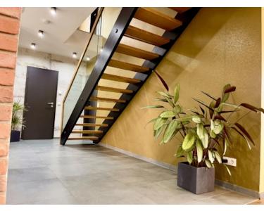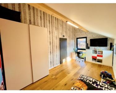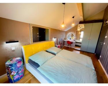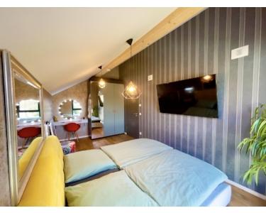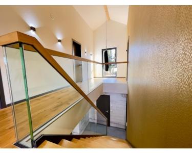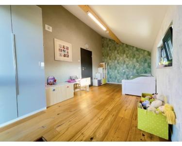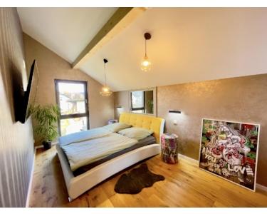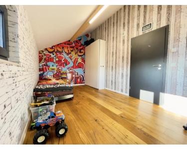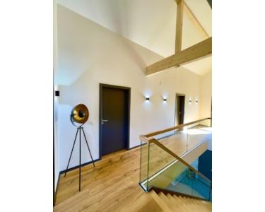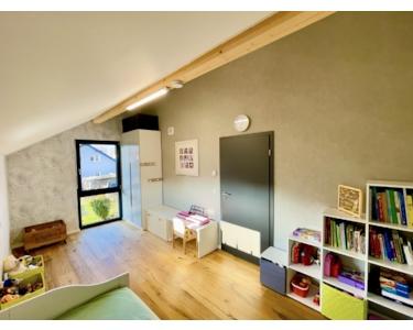 Jedes Zimmer erstrahlt durch schöne dekorative Wandverkleidung und das hochwertige rustikale Eiche Parkett, naturgeölt, welches einen warmen und einladenden Charakter schafft. Die großzügigen Raumhöhen im Erdgeschoss von 2.52m und im Obergeschoss mit einem lichten Kniestock von 1.80m verleihen dem Haus eine offene und einladende Atmosphäre. Die Designer-Treppe aus massivem Eichenholz mit Glasgeländer setzt dabei ein modernes Statement.