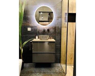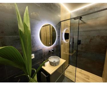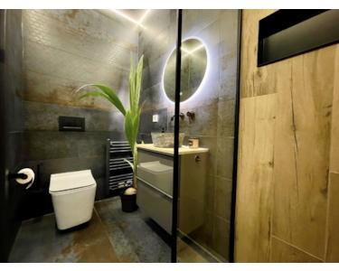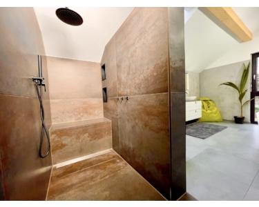 Die Badezimmer sind wahre Oasen der Entspannung. Im Erdgeschoss befindet sich ein Gäste-WC mit Dusche, das mit Designer Fliesen in Metall Rost Optik und in der Dusche mit Holzdielen in Goldbraun ausgestattet ist. Das obere Badezimmer begeistert mit hochwertiger Innengestaltung, inklusiven Wänden in Feinputztechnik-Schalbetonoptik und großzügige Dachfenster, das zusätzliches Tageslicht spendet. Modernste Sanitäranlagen und elegante Designelemente verleihen den Räumen ein einzigartiges Flair.