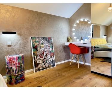 -Jedes Zimmer hat seine eigene Gestaltung mit einer zeitlosen Tapete, Böden sind in KAHRS Parkett "Eiche Country" Rustikal, naturgeölt, leicht gebürstet, mit Microfase, 14x190x1900 mm. Quadratmeterpreis über 70 €.
