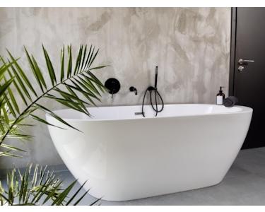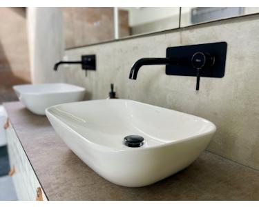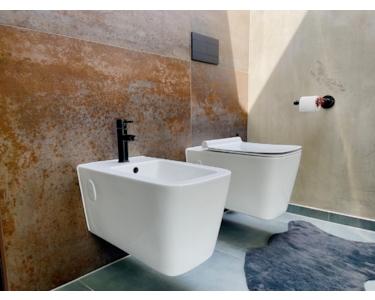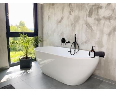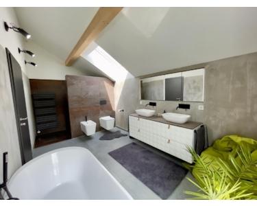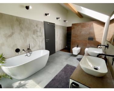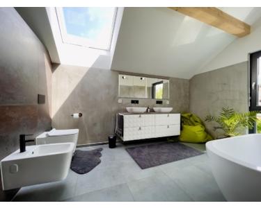 -Badezimmer Innengestaltung, Wände in Marmor-Feinputztechnik Schalbetonoptik, Großes Dachfenster (1,10m * 1,10m) für noch mehr Tageslicht im Badezimmer. Freistehende Badewanne, Doppelter Waschtisch mit eleganten Design Aufsatzwaschbecken und Unterputz Armatur in Black-Matt Optik. Die große Dusche lädt sie zu einem einzigartigen Erlebnis mit einer Regendusche ein. Die Wandbeläge sind mit italienischen Serenissima Ceramiche 1m*1m grossen Feinsteinzeugfliese in Metaloptik. Metallo Ruggine Ret. Moderne Hänge WC und Bidet mit einem eingebauten Spülkasten in der Wand.