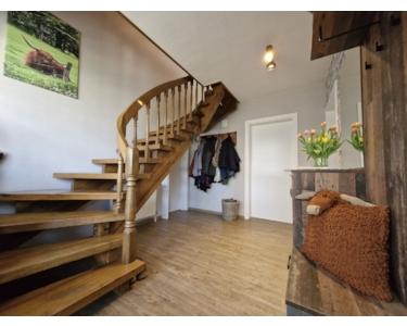 Über eine handgefertigte Holz-Treppe gelangt man in das Obergeschoss. Hier befinden sich ein Büro, ein großes Badezimmer, das Eltern-Schlafzimmer und 3 Kinder-Schlafzimmer. Eine zweite Holz-Treppe führt in den Dachboden, dieser wurde zu einem weiteren Kinderzimmer ausgebaut.