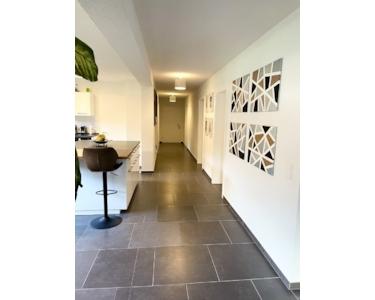 Der Wohn- , Ess- und Kochbereich ist offen geschnitten und die gesamte Wohnung ist durch die zahlreichen, großen Fenster lichtdurchflutet und hell.