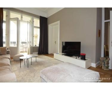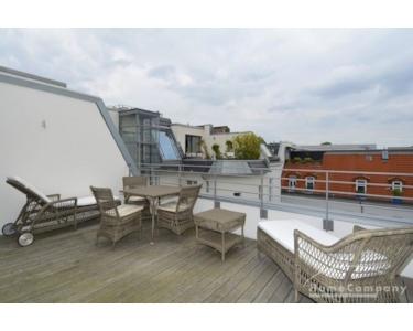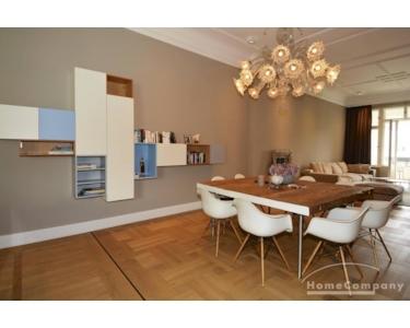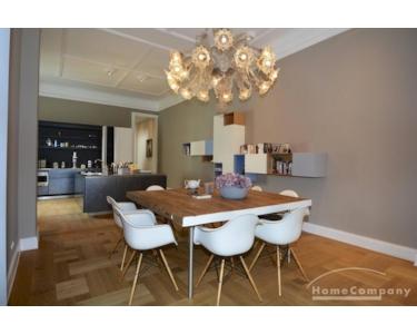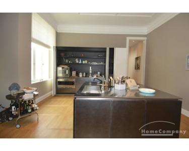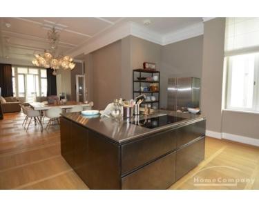 Diese hoch exklusive Maisonette-Altbauwohnung im 4. Obergeschoss mit Aufzug erstreckt sich weitläufig auf zwei Etagen. Die sanierte Altbauwohnung besticht mit wunderschönen Stuckverzierungen, Flügeltüren und hochwertigen Parkettfußboden. Luxuriöse Möblierung, großzügiger Wohnraum mit Westloggia und ausdehnenden Ess-/Küchenbereich, maßgefertigte Boffi-Einbauküche. Vier große, gemütliche Schlafzimmer, eines mit Ankleide und tagesbelichtetem Badezimmer ensuite. Separates Gästeduschbad mit Regendusche und Fußbodenheizung, zwei weitere Gäste-WCs, drei Balkone, eine Westloggia und eine großzügige Dachterrasse.