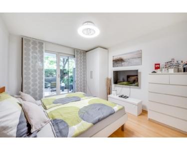 Die Wohnung überzeugt durch einen durchdachten Grundriss: Der helle Wohnbereich öffnet sich zur großzügigen Südwest-Terrasse, die zu entspannten Stunden im Freien einlädt. Zusätzlich steht Ihnen eine zweite Terrasse mit Ostausrichtung zur Verfügung – ideal für ein Frühstück in der Morgensonne, zumal sowohl die Küche als auch das Schlafzimmer direkten Zugang zu dieser Terrasse bieten. Beide Terrassen sind den jeweils zugeordneten Gärten im Sondernutzungsrecht vorgelagert und erweitern den Wohnraum ins Grüne .