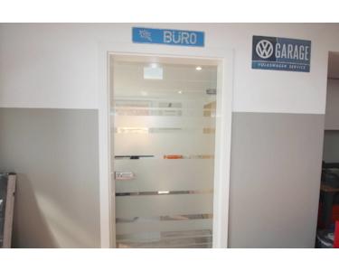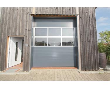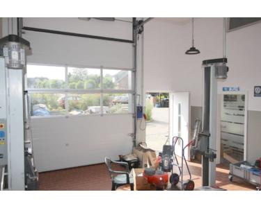 Werkstattblick auf großes Rolltor u. sep. Eingangstür