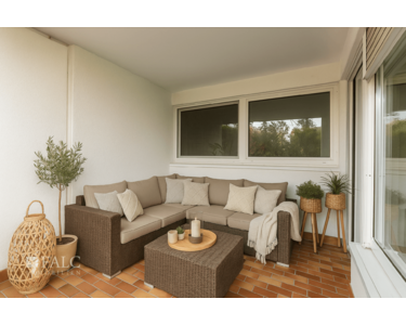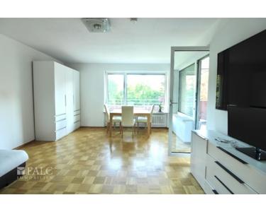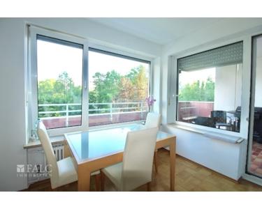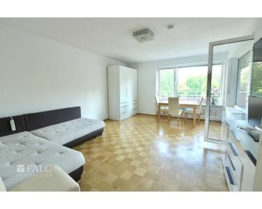 Geradeaus gelangen Sie auf der linken Seite in das helle und großzügige Wohnzimmer, das den Mittelpunkt der Wohnung bildet. Die großen Fenster lassen den Raum mit Tageslicht durchfluten und verleihen ihm eine einladende Atmosphäre. Von hier aus gelangen Sie auf die großzügige, überdachte Loggia, die einen herrlichen Blick in den grünen Innenhofpark bietet und dank der Überdachung auch in der kühleren Jahreszeit zum entspannten Verweilen im Freien einlädt.