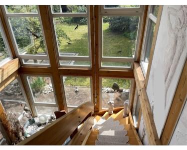 Die gesamte Wohnfläche im Obergeschoss wurde offen gestaltet, um die Individualität der hohen Raumhöhe eine Besonderheit zu verleihen. Das Studio mit einer Galerie, die über eine Holztreppe zu erreichen ist, bietet einen spektakulären Ausblick in die Natur.