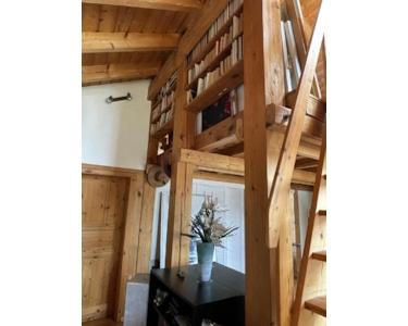 Der Fußboden im Obergeschoss ist mit Holzdielen ausgelegt. Auch hier kann zusätzlich ein Kamin angeschlossen werden. Im Obergeschoss befindet sich eine kleine Küche, ein Bad mit Dusche, Badewanne und WC, ein Schlafzimmer und ein großes Studio. Die Terrasse aus Bankirai im Obergeschoss ist 28m² groß und lädt auch noch zusätzlich zum Verweilen ein mit einer hervorragender Aussicht.