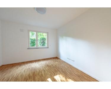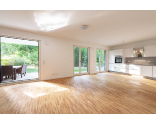 Eine zentrale Diele mit Gäste-WC führt ins Wohnzimmer. Der großzügige Wohn-Essbereich mit offener Einbauküche bildet das Herzstück der Wohnung. Bodentiefe Fenster lassen viel Licht herein und schaffen eine einladende Wohnatmosphäre. Von hier aus gelangt man auf die überdachte Westterrasse sowie in den privaten Garten (Sondernutzungsrecht), der auch über ein Gartenhaus für Geräte verfügt.