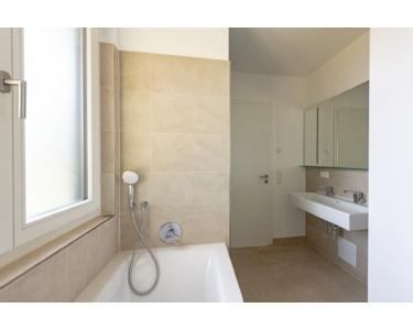 Nebenan liegt das gut ausgestattete Gästebad mit bodengleicher Dusche und WC. Der Flur führt Sie weiter zu den beiden Schlafzimmern, wovon das größere über einen eigenen Terrassenzugang und ein Bad-en-Suite verfügt. Das Tageslichtbad lässt mit einem Doppelwaschtisch, Badewanne und Regendusche keine Wünsche offen.