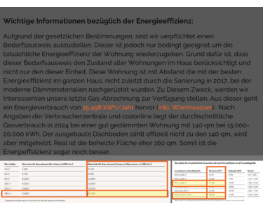 Aufgrund der gesetzlichen Bestimmungen, sind wir verpflichtet einen Bedarfsausweis auszustellen. Dieser ist jedoch nur bedingt geeignet um die tatsächliche Energieeffizienz der Wohnung wiederzugeben. Grund dafür ist, dass dieser Bedarfsausweis den Zustand aller Wohnungen im Haus berücksichtigt und nicht nur den dieser Einheit. Diese Wohnung ist mit Abstand die mit der besten Energieeffizienz im ganzen Haus, nicht zuletzt durch die Sanierung in 2017, bei der moderne Dämmmaterialien nachgerüstet wurden. Zu diesem Zweck, werden wir Interessenten unsere letzte Gas-Abrechnung zur Verfügung stellen. Aus dieser geht ein Energieverbrauch von 15.498 kWh im Jahr hervor. Nach Angaben der Verbraucherzentrale und co2online liegt der durchschnittliche Gasverbrauch in 2024 bei einer gut gedämmten Wohnung mit 140 qm bei 15.000-20.000 kWh. Der ausgebaute Dachboden zählt offiziell nicht zu den 140 qm, wird aber mitgeheizt. Real ist die beheizte Fläche eher 160 qm. Somit ist die Energieffeizienz sogar noch besser.
