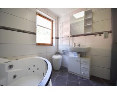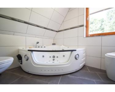 Dachgeschoss = Bad mit Eckwanne, WC und Waschbecken, Spiegelschrank, Handtuchheizkörper