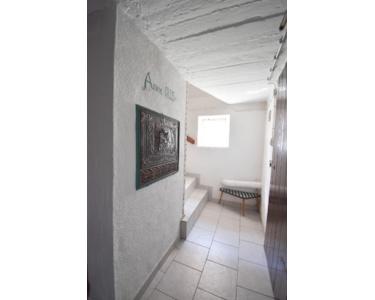 Kellereingang = Holztür mit Glasausschnitt, überdacht
