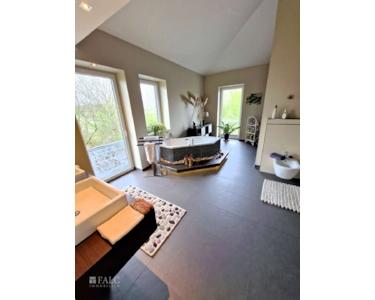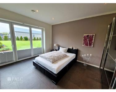 Das Obergeschoss bietet auf 114 m² ein weiteres Badezimmer mit Sauna-Vorbereitung, ideal für Wellness und Entspannung. Die großzügige Galerie eignet sich perfekt als großes Büro oder zusätzlicher Wohnraum. Hier befinden sich außerdem drei Schlafzimmer und zwei Ankleidezimmer. Auch im Obergeschoss sorgen bodentiefe Fenster für helle und freundliche Räume.
