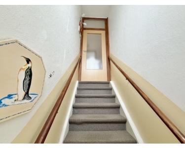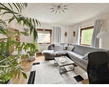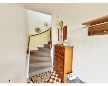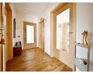 Über einen separaten Nebeneingang gelangen Sie in einen großen Windfang mit Zugang in die obere Etage, wo sich eine attraktive und großzügige ca. 77 m² große Drei-Zimmerwohnung befindet.
