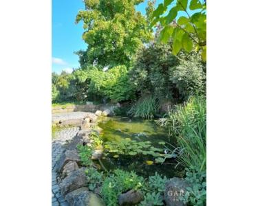 Wunderschön angelegt und mit stimmungsvoller Beleuchtung, einem Bachlauf und Teich ausgestattet.
