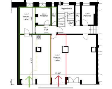 1: Grün eingezeichnete Fläche mit ca. 76m2 plus ca. 26m2 Lagerfläche in zwei Kellerabteilen für €7.800 pro Monat. Eine Schaufenstertüre und zweites Schaufenster an der Front.