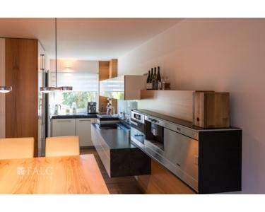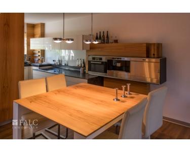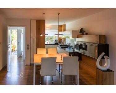 Angrenzend an den Essbereich befindet sich die modern und individuell gestaltete Küche, die nicht nur durch ihre funktionale Anordnung sondern besonders durch ihre optische Gestaltung überzeugt. Hier macht das Kochen wirklich Spaß und auch das Auge isst ja bekanntlich mit.