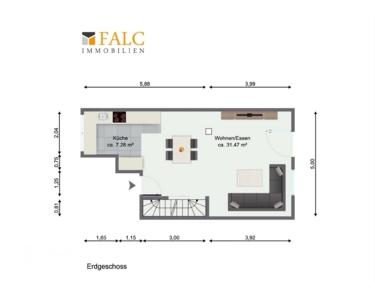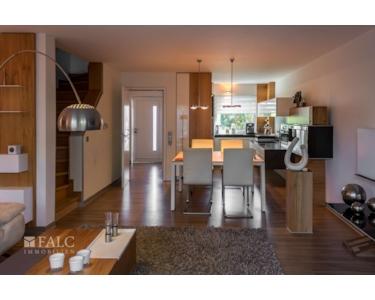 Beim Betreten durch die, im modernen Holzdesign gestaltete, Hauseingangstür gelangt man in die Diele und von da aus direkt in den großzügigen Wohn-/Essbereich, der sofort einen gemütlichen und sehr angenehmen ersten Eindruck vermittelt. Die offenen Gestaltung die großen Fenstern und die große, gemütliche Couchecke laden zum Entspannen, Fernsehschauen und zu gemütlichen Familienabenden ein. Der Essbereich, der Küche und Wohnbereich zumindest optisch trennt, ist idealer Mittelpunkt für das Familienleben - Kochen, Essen, Freizeit gestalten - immer gemeinsam.