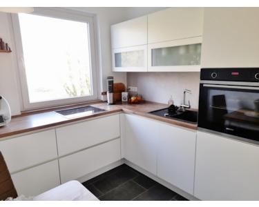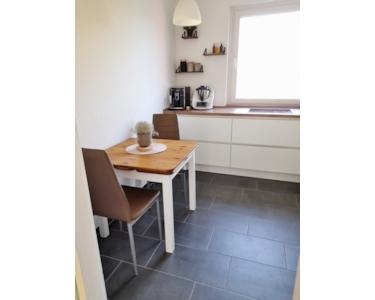 Zur vorderen Hausseite befindet sich eine modern eingerichtete Küche mit elektrischen Geräten, wie Ceranfeld, Backofen sowie einer Kühl- und Gefrierkombination. Die helle Einbauküche wurde vor fünf Jahren neu eingebaut und sie besticht durch moderne Front und eine geschmackvolle Arbeitsplatte. Die anthrazitfarbenen Bodenfliesen verleihen dem Raum einen modischen Charakter. Einen kleinen Essplatz können Sie hier ebenfalls unterbringen.