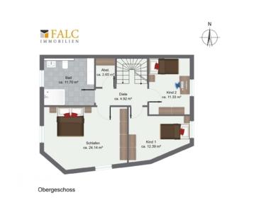 Das Obergeschoss verfügt über das Elternschlafzimmer, zwei Kinderzimmer, ein großes Badezimmer und eine praktische Abstellkammer. Bodentiefe extra breite Fenster sorgen für viel Tageslicht auf dieser Etage.