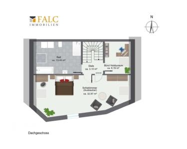 Im Dachgeschoss befinden sich ein großzügiges Studio (ca. 33 m²), ein weiteres Badezimmer mit Waschmaschinenanschluss und ein kleines Büro/Hobbyzimmer. Die teilweise offen gelegten Dachbalken verleihen diesem Stockwerk ein großzügiges Raumgefühl.